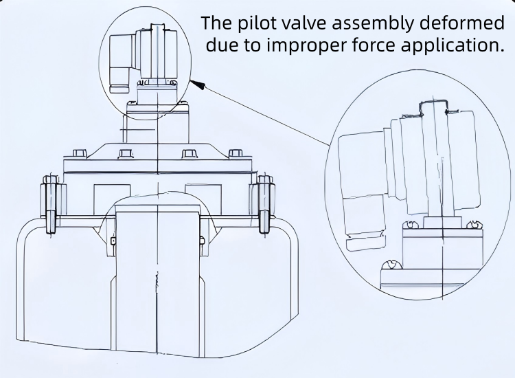 Selepas pemasangan, operasi kimpalan pada tangki udara, bebibir yang disambungkan, atau paip tiupan adalah dilarang untuk mengelakkan percikan kimpalan atau kerosakan suhu tinggi pada diafragma. Kendalikan dengan berhati-hati semasa pengangkutan atau pemasangan untuk mengelakkan kerosakan hentaman pada pemasangan pandu injap solenoid, yang boleh mengubah bentuk lengan kili, menyebabkan batang yang bergerak tersekat dan menghalang operasi injap.